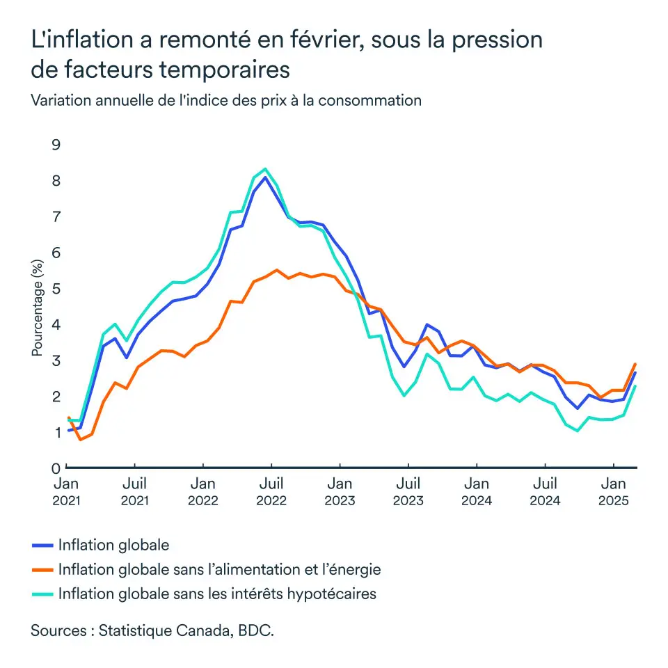 La hausse de l’inflation en février est due en partie à des facteurs temporaires. Il est également important de noter que les droits de douane influenceront les prix des biens, qui avaient enregistré une hausse de 1,5 % en février. Par ailleurs, l’inflation des prix des services se situe entre 3,5 et 4,0 % depuis des mois. L’augmentation de l’inflation dans ce secteur est fortement liée à la croissance des salaires. Mais, la pression sur les prix des services pourrait diminuer avec le ralentissement du marché du travail.