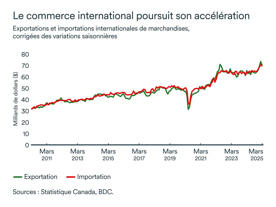 Les exportations canadiennes ont atteint un sommet en janvier, mais elles ont ralenti en février. Ce ralentissement était anticipé car les États-Unis ont probablement accéléré l’achat de biens canadiens avant l’imposition de droits de douane.