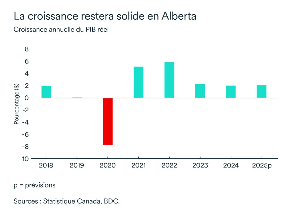 L'expansion du TMX a créé un élan dans le secteur pétrolier, la production ayant atteint des niveaux record en 2024. Avec des taux d'intérêt plus bas, et peu de tarifs ayant un impact direct sur la province, la croissance devrait rester forte en 2025 et égaler les niveaux de 2 % atteints l'an dernier. De grands projets contribueront à stimuler l'économie dans les années à venir, positionnant l'Alberta au premier rang des provinces.