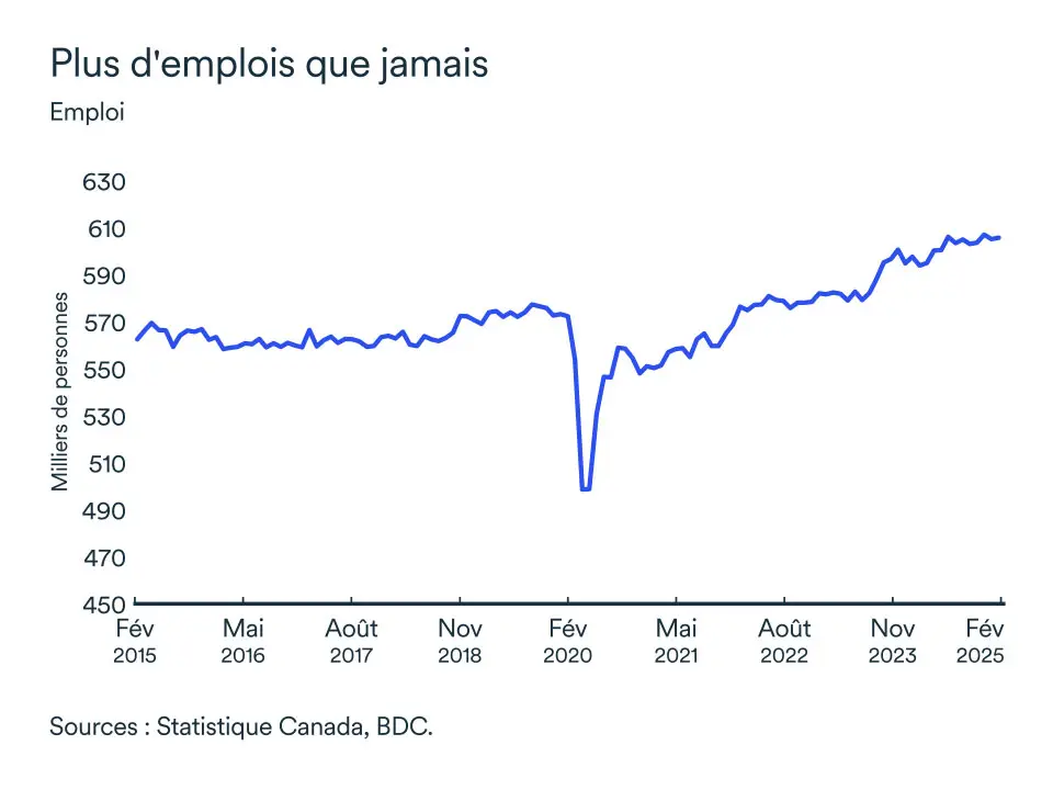 Les menaces de droits de douane ont affecté directement les entreprises, tandis que les consommateurs sont devenus de plus en plus prudents, reflétant des inquiétudes concernant l'économie et l'emploi. En mars, le nombre d'emplois a diminué (-33 000) de manière significative pour la première fois depuis janvier 2022. Ce recul est probablement attribuable aux secteurs clés visés par ces droits de douanes puisque les pertes se sont concentrées en Ontario et en Alberta.