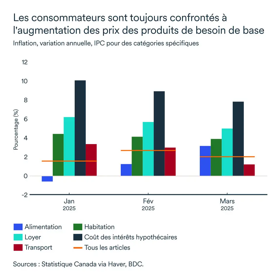 Les efforts de la Banque du Canada pour contrôler l’inflation ont porté fruit. L’inflation mesurée par la variation annuelle des prix à la consommation oscille en effet dans la fourchette cible depuis plus d’un an. Cependant, c’est dans les postes budgétaires difficilement substituables que l’on retrouve encore de forts accroissements de prix sur un an. Les niveaux d’inflation liés au logement (+3,9 %) diminuent pour leur part lentement. Les consommateurs canadiens ont donc peu de marge de manœuvre puisqu’il est difficile d’économiser sur le loyer ou les paiements hypothécaires.
