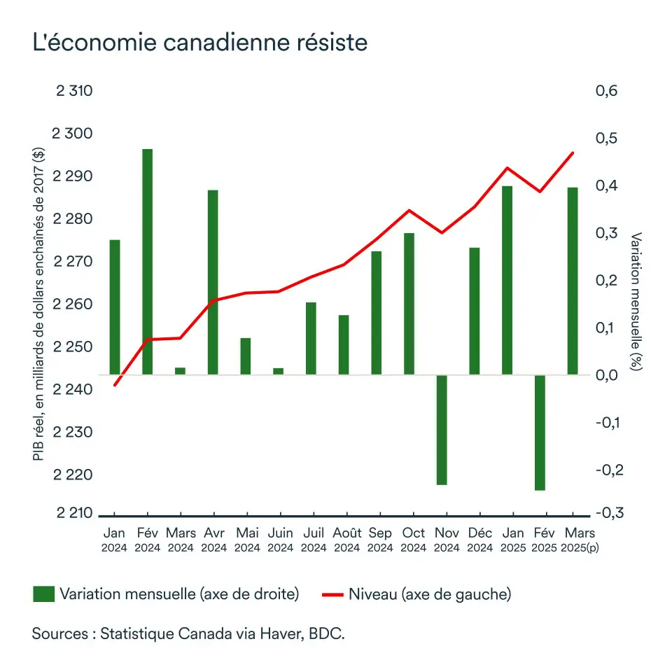 L’économie canadienne avait repris de l’élan à la fin de 2024, alors que les baisses successives de taux d’intérêt agissaient enfin sur l’économie et encourageaient une reprise de l’investissement résidentiel et de la consommation des ménages. Les premiers trois mois de l’année auront connu une croissance en dents de scie – évoluant essentiellement au rythme des annonces sur les tarifs et de l’incertitude économique qui en a découlé.
