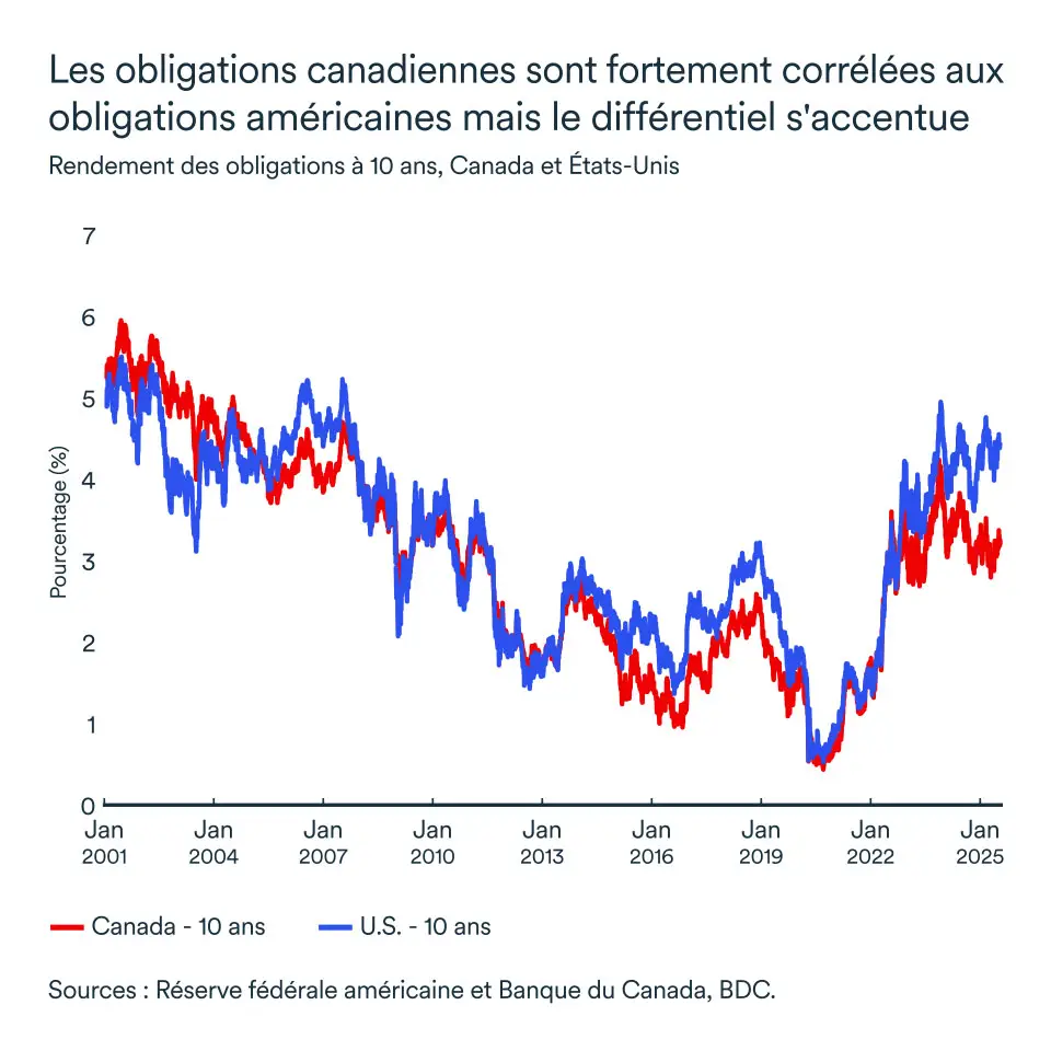Pour bien comprendre la direction que prendront les taux d’intérêt au Canada, il faut aussi se tourner vers les États-Unis où les taux d’intérêt ont une influence importante sur les nôtres. En effet, les investisseurs internationaux comparent constamment les rendements des obligations américaines et canadiennes. Si les obligations américaines offrent un rendement plus élevé, les capitaux risquent alors de quitter le Canada et de pousser les taux canadiens à s’ajuster pour rester compétitifs.