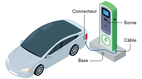 Borne de recharge – Elle fonctionne parce qu’elle est connectée directement à un panneau de distribution électrique ou à une prise électrique. La plupart des bornes de recharge sont équipées d’un ou de deux câbles de recharge, souvent appelés «baguettes» de recharge. Chaque câble de recharge peut recharger un véhicule à la fois. Une fois que la conductrice ou le conducteur a branché le câble sur son véhicule, un voyant lumineux s’allume pour lui signaler A) qu’une connexion sécurisée a été établie et B) que le véhicule est en train de se charger.