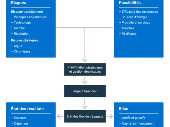 Le tableau ci-dessous permet de comprendre rapidement comment les risques et les possibilités liés au climat peuvent interagir avec vos revenus, vos dépenses, vos actifs et vos passifs, ainsi que vos capitaux et votre financement.