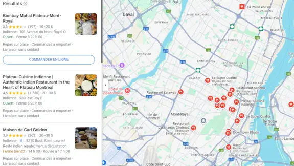 Lorsque Google reçoit une demande de recherche avec un intérêt local, comme «resto indien à emporter centre-ville de Montréal», «magasins de chaussures près de chez moi» ou même simplement «réparation auto», les résultats s’affichent sur une carte avec une liste d’entreprises qui pourraient correspondre à ces critères. Les entreprises qui ont bien configuré leur référencement naturel local sont plus susceptibles de figurer sur cette carte.