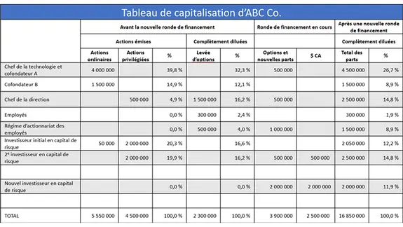ABC Co. a été fondée par une équipe de propriétaires d’entreprise. Le cofondateur A, qui est demeuré chef de la technologie, s’est vu attribuer 500 000 nouvelles actions dans le cadre de la nouvelle ronde de financement pour limiter sa dilution. Ainsi, même si son pourcentage de participation a diminué de 13 points de pourcentage, la valeur de ses avoirs a augmenté de 500 000 $. Entre-temps, le cofondateur B, qui a quitté l’entreprise, a vu sa part de propriété diminuer, tandis que la valeur de ses avoirs est demeurée la même en raison de la hausse de la valeur totale de l’entreprise.