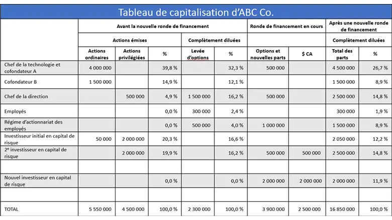 Cet exemple montre à quel point les tableaux de capitalisation peuvent être compliqués lorsqu’on considère les fondatrices ou fondateurs, le nouveau chef ou cheffe de la direction, les investisseuses et investisseurs initiaux ainsi que les investisseuses et investisseurs de série A.